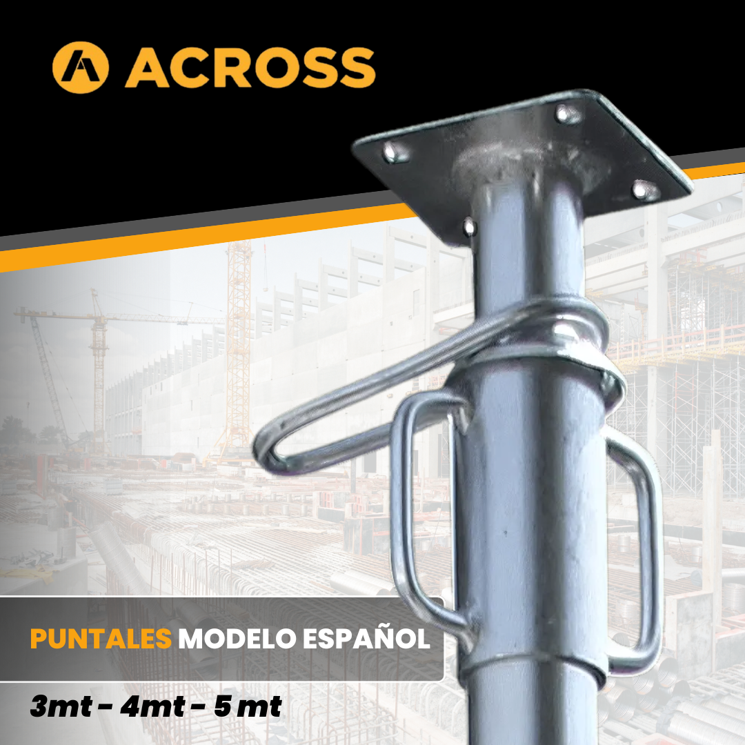 Puntales metálicos modelo español de 3 mt , 4 mt y 5 mt, ideales para el apuntalamiento seguro en obras de construcción. Fabricados en acero de alta resistencia, ofrecen soporte confiable, regulación en altura y facilidad de uso en proyectos de losas y encofrados.
